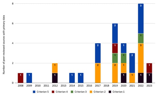 Of the articles that were recorded as containing text related to the five criteria, the majority contained secondary information as context or discussion. A much smaller proportion of the dataset presented primary data or anecdotal data containing new information as evidence to support or oppose the criteria. Four articles presented primary data relating to criterion 1 (29% of 14 articles for this criterion), 10 for criterion 2 (20% of 51 articles), three for criterion 3 (19% of 16 articles), three for criterion 4 (out of n = 14, 21%), and 13 for criterion 5 (31% of 42 articles) (Figure 3).
