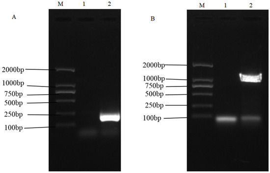 The ChXCL1-EmEF1α fragment was synthesized in vitro. ChXCL1 and EmEF1α were successfully amplified using the synthesized gene of ChXCL1-EmEF1α. The result of the agarose gel electrophoresis showed that ChXCL1 had a size of 231 bp (Figure 1A) and EmEF1α had a size of 1362 bp (Figure 1B), which corresponds to the molecular weight of each gene. Subsequently, the ChXCL1-EmEF1α, ChXCL1, and EmEF1α gene fragments were ligated with the pET-28a plasmid, respectively. The success of the recombinant plasmids of pET-28a-ChXCL1-EmEF1α, pET-28a-ChXCL1, and pET-28a-ChXCL1 were confirmed by restriction enzyme digestion and sequence analysis.