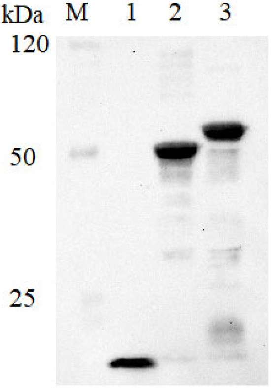 Protein expression in Western blot. M = marker, pET28a-XCL1 (line 1), pET28a-EmEF1α (line 2), and pET28a-ChXCL1-EmEF1α (line 3) were established by the Western blotting method.
