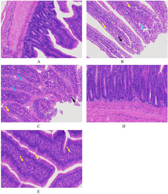Histopathological examination of intestinal tissues provided further evidence of vaccine protection (Figure 3). While unchallenged controls showed normal intestinal architecture with intact villi (Figure 3A), challenged controls displayed pathological changes including mucosal epithelial detachment (Figure 3B, blue arrow), epithelial cell shedding with cytoplasmic alterations (Figure 3B, black arrow), and lamina propria lymphocyte infiltration (Figure 3B, yellow arrow). The ChXCL1 group exhibited similar lesions as that in infected controls (Figure 3C). In contrast, chickens immunized with EmEF1α (Figure 3D) or ChXCL1-EmEF1α (Figure 3E) showed only minimal histological changes, limited to slight intraepithelial lymphocyte infiltration.