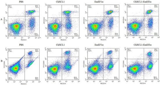 The proportion of the T cell subpopulation in chickens immunized with PBS, ChXCL1, EmEF1α, and ChXCL1-EmEF1α was determined by flow cytometry 14 days after the second immunization. (A) Detection of CD3 + CD4+T lymphocytes in immunized chickens. (B) Detection of CD3 + CD8+T lymphocytes in immunized chickens.