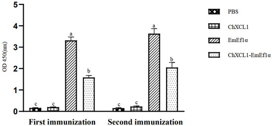 Serological analysis demonstrated strong humoral immune responses to vaccination. The EmEF1α group generated significantly higher anti-EF1α IgY titers than other groups at 14 days post-primary immunization (p < 0.05), with this difference persisting following booster immunization. The EmEF1α group consistently showed the highest antibody levels throughout the study period. Notably, there was no significant difference in IgY antibody levels between the PBS and ChXCL1 control groups (p > 0.05) (Figure 5).