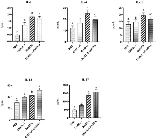 The concentration of cytokines IL-2, IL-4, IL-10, IL-12, and IL-17 in serum after the second immunization. Significant difference (p < 0.05) between data was annotated with different letters. No significant difference (p > 0.05) between data was annotated with the same letter.