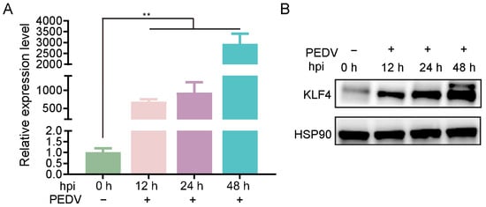 KLF4 expression of mRNA (A) and protein (B) levels in PEDV-infected cells at various time points (0, 12, 24, and 48 h). hpi: hours post-infection; PEDV: porcine epidemic diarrhea virus. ** p < 0.01.