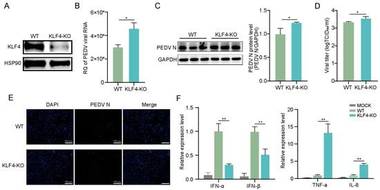 KLF4 knockout promotes PEDV replication and modulates host immune response. (A) Western blot analysis of KLF4 in KLF4-KO and WT cells. (B) Viral RNA levels in PEDV-infected KLF4-KO and WT cells at 48 hpi. (C) Western blot analysis of PEDV N protein in PEDV-infected KLF4-KO and WT cells at 48 hpi. (D) Infectious viral titers determined by TCID50 in supernatants of PEDV-infected KLF4-KO and WT cells at 48 hpi. (E) Immunofluorescence microscopy of PEDV N protein (green) at 48 hpi in PEDV-infected KLF4-KO and WT cells. Nuclei were counterstained with DAPI (blue). Scale bars: 100 µm. (F) Relative expression of interferons and pro-inflammatory cytokines in MOCK, PEDV-infected KLF4-KO, and WT cells at 48 hpi. KLF4-KO: KLF4 knockout cells; WT: wild-type cells; MOCK: mock-infected cells. Data are presented as mean ± SD (n = 3). * p < 0.05, ** p < 0.01.