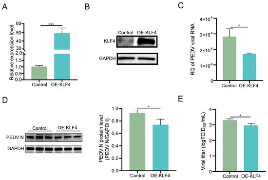 To verify the function of KLF4 during PEDV infection, we further generated KLF4 overexpression cells. qRT-PCR and Western blot analyses confirm dramatically higher expression of KLF4 at both mRNA and protein levels in the overexpression cells (Figure 3A,B). Subsequently, we infected them with PEDV and observed that viral RNA and protein expression were significantly decreased in KLF4 overexpression cells compared to controls (Figure 3C,D). In addition, infectious viral titers in the supernatants of KLF4 overexpression cells were significantly lower than those of controls (Figure 3E). Overall, these results support the critical role of KLF4 in suppressing PEDV infection in IPEC-J2 cells.