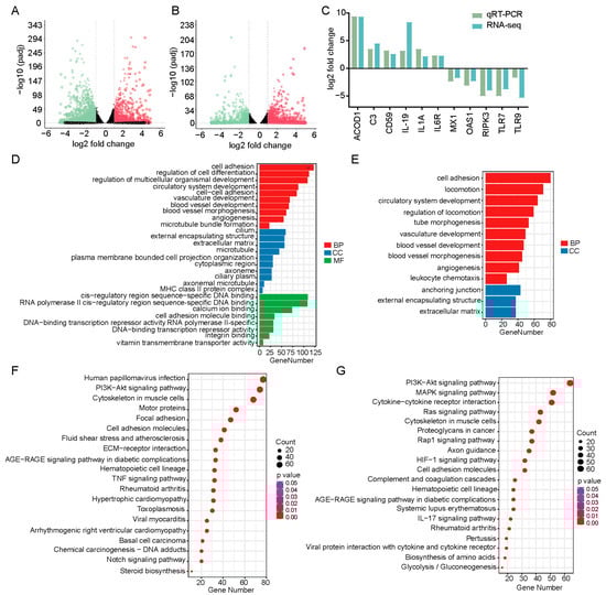 Transcriptomics analysis in KLF4 knockout and wild-type cells with or without PEDV infection. (A) Volcano plots of DEGs between PEDV-infected and mock-infected cells. (B) Volcano plots of DEGs between PEDV-infected KLF4 knockout and wild-type cells. The red and green dots represent significantly upregulated and downregulated genes, respectively. (C) Expression changes in DEGs quantified by RNA-seq and qRT-PCR. (D,E) Gene ontology analysis for DEGs shown in (A,B), respectively. The red, blue, and green bars indicate biological process, cellular component, and molecular function, respectively. (F,G) KEGG pathways analysis for DEGs shown in (A,B), respectively.