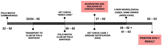 On 22 February (see Figure 2, outbreak timeline), a polo match was held 170 km south from the CDP (near the city of Chimbarongo in the O’Higgins region). Horses from four different owners were brought together at the match. Two owners brought their horses to the CDP after the match, while the horses of the other two owners remained in the region.