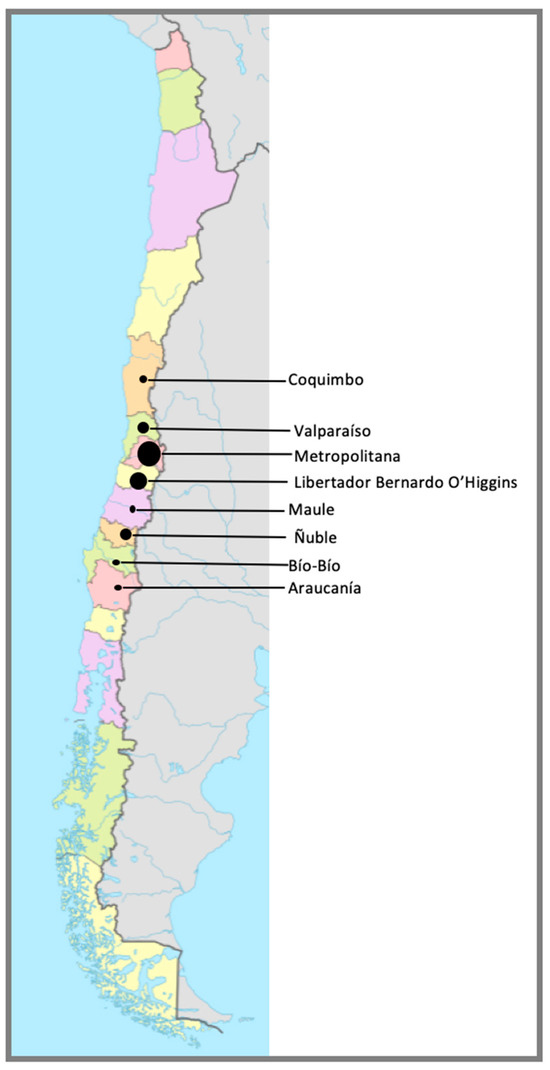 Geographic distribution of the regions of origin of horses housed at CDP at the time of the outbreak (n = 567). Each region is delimited by a bordering line and a different color. The size of the circle in each region (Coquimbo, Valparaíso, Metropolitana, Libertador Bernardo O´Higgins, Maule, Ñuble, Bío-Bío, Araucanía) is associated with the number of horses originating from each region—Coquimbo: 1.8%; Valparaíso: 8.6%; Metropolitana: 44.6%; Libertador Bernardo O’Higgins; 30%. Maule: 1.6%; Ñuble: 10.1%; Bío-Bío: 1.2%; and Araucanía: 2.1%.