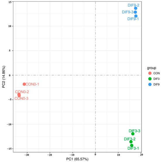 Principal component analysis (PCA) was performed on the FPKM of all samples from the CON0, DIF3, and DIF9 groups (Figure 1). The results indicated a clear separation of sample points into distinct groups, with samples within each group clustering closely together. Furthermore, the samples from different groups exhibited significant discrimination, suggesting high repeatability within groups and notable differences among samples from varying groups.