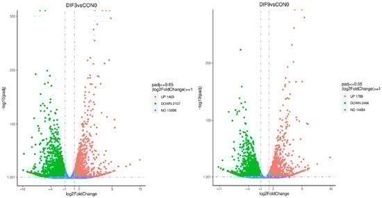 Genes within the threshold were classified as DEGs based on the screening criteria of |log2(FC)| ≥ 1 and FDR < 0.05 (Figure 2). It showed that a total of 3576 DEGs were screened out from DIF3 vs. CON0, among which 1469 genes were upregulated and 2107 genes were downregulated. A total of 4254 DEGs were screened out from DIF9 vs. CON0, among which 1788 genes were upregulated and 2466 genes were downregulated.