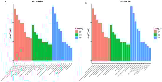 GO enrichment analysis of differentially expressed genes at different stages of adipoblastic differentiation. (A) DIF3 vs. CON0; (B) DIF9 vs. CON0. BP: biological processes; CC: cellular components; MF: molecular functions. The y-coordinate is the significance level of GO term enrichment, and the x-coordinate is the name of GO term.