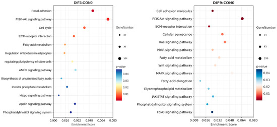 To clarify the regulatory role of DEGs in adipocyte differentiation and the associated signaling pathways, KEGG pathway enrichment analysis was performed on DEGs from DIF3 vs. CON0, as well as DIF9 vs. CON0 (Figure 4). The results indicated that DEGs from DIF3 vs. CON0 are co-enriched in 315 pathways, with significant enrichment in 77 pathways, including pathways such as phosphoinositide 3-kinase-serine/threonine kinase (PI3K-AKT), cell cycle, ECM–receptor interactions, and fatty acid metabolism. Similarly, DEGs from DIF9 vs. CON0 were enriched in 316 pathways, with significant enrichment in 85 pathways, including metabolic pathways like PI3K-AKT, PPAR, forkhead box O (FoxO), MAPK, fatty acid metabolism, and glycerophospholipid metabolism.
