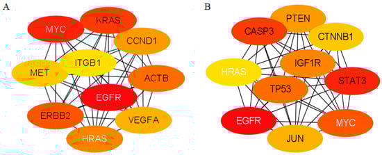 Screening of core hub genes involved in adipogenic metabolism. (A) DIF3 vs. CON0; (B) DIF9 vs. CON0. The white annotated genes are the common core hub gene. The hub color from dark to light indicates the assignment from high to low. ACTB: β-actin; CASP3: caspase 3; CCND1: cyclin D1; CTNNB1: catenin beta 1; EGFR: epidermal growth factor receptor; ERBB2: Erb-b2 receptor tyrosine kinase 2; HRAS: HRas proto-oncogene; IGF1R: insulin-like growth factor 1 receptor; ITGB1: integrin subunit beta 1; JUN: JUN proto-oncogene; KRAS: KRAS proto-oncogene; MET: receptor tyrosine kinase; MYC: MYC proto-oncogene; PTEN: phosphatase and tensin homolog; TP53: tumor protein p53; STAT3: signal transducer and activator of transcription 3; VEGFA: vascular endothelial growth factor A.