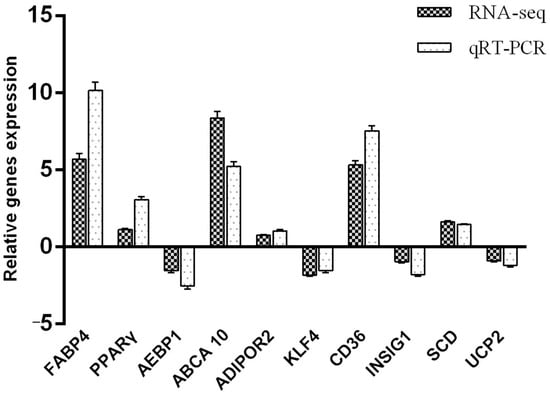 Comparison of RNA-seq and qPCR results. ABCA10: ATP-binding aassette subfamily A member 10; ADIPOR2: adiponectin receptor 2; AEBP1: adipocyte enhancer binding protein 1; CD36: CD36 antigen; FABP4: fatty acid binding protein 4; INSIG1: insulin-induced gene 1; KLF4: Kruppel-like factors; PPARγ: peroxisome proliferators-activated receptors γ; SCD1: stearoyl-CoA desaturase 1; UCP2: uncoupling protein 2.