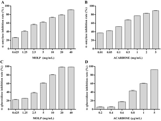 Effects of MOLP and acarbose on enzyme inhibition rate. (A,B) Inhibition rate of α-amylase by MOLP and acarbose. (C,D) Inhibition rate of α-glucosidase by MOLP and acarbose.