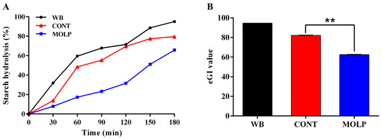 In vitro digestion experiments showed that WB starch was hydrolyzed fastest within 180 min. The starch hydrolysis rate was lower in the MOLP group compared to the CONT group. At 180 min, the starch hydrolysis rate was 79.58% and 65.82% in the CONT and MOLP group, respectively (Figure 2A). In addition, the eGI of the MOLP group was significantly lower than that of the CONT group (p < 0.01, Figure 2B).