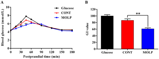 Effects of MOLP on postprandial glucose (A) and GI (B) of snacks in dogs. “**” indicates p < 0.01.