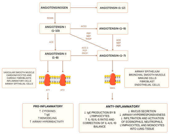 Experimental and clinical studies have demonstrated that the renin–angiotensin system (RAS) is a key modulator involved in the pathophysiology of asthma in a murine model [75]. Figure 1 provides a simplified representation of the inflammatory balance regulated by RAS. The RAS, primarily known for its role in blood pressure regulation, significantly influences inflammatory processes and tissue remodeling, making it central to the development and progression of asthma [76]. Notably, the detrimental effects of the AngII/AT1 pathway have been confirmed in inflammation, airway remodeling, and airway hyperresponsiveness in asthma [75].