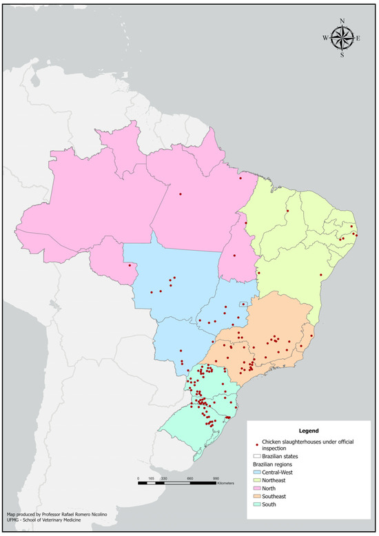The distribution of Brazilian chicken slaughter establishments under the federal inspection service is shown in Figure 1.