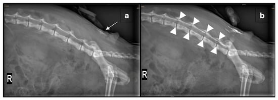 Given the severity of the trauma, an extradural catheter (Perifix® One Paed, 24G, 720 mm, B. Braun Medical AG, Melsungen, Germany) was placed using a Tuohy extradural needle (Perican® 20G, B. Braun Medical AG, Germany) with the patient positioned in sternal recumbency. After aseptic preparation of the lumbosacral region and placement of a sterile drape, the needle was inserted at the lumbosacral junction. The extradural space was identified using the lack-of-resistance technique with saline and air, and an aspiration test was negative. A lateral radiograph was then obtained, and the catheter was advanced 5 cm. Diluted non-ionic iodinated contrast medium (0.5 mL iohexolum (Accupaque, 300 mg/mL, GE Healthcare AG, Opfikon, Switzerland) diluted in 1 mL NaCl 0.9%) was injected through the catheter, initially with a low volume to visualise the catheter’s position (Figure 1a). A repeat radiograph, taken after the entire contrast volume was injected, confirmed extradural placement and appropriate contrast spread (Figure 1b). The catheter was then trimmed to 5 cm from its exit site, and a connector as well as a bacterial filter (Perifix® EF 0.2 µm, B. Braun Medical AG, Germany) were attached. The catheter was primed with 0.5% ropivacaine, and the bacterial filter was secured with sutures cranial to the insertion site. These were then covered with a transparent occlusive bandage (Cosmopor transparent, 9 × 7 cm, Hartmann AG, Heidenheim, Germany) and a purpose-made wound protection body used to cover the surgical wounds, as well as the catheter. Subsequently, 1 mL of 0.5% ropivacaine (0.13 mL/kg) was administered, with repeat injections given at 6 h intervals overnight.