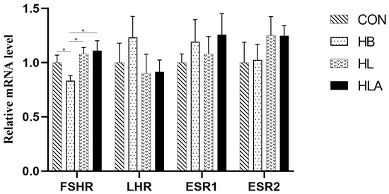 Relative gene expression of productive hormone-related genes. CON: a group was maintained at 24 °C with a basal diet; HB: a group was exposed to 32 °C, fed basal diet; HL: a group was exposed to 32 °C, low-protein amino acid-balanced diet; HLA: a group was exposed to 32 °C low- protein amino acid-balanced diet with 0.5% Astragalus polysaccharides. n = 6; * indicates p < 0.05 relative to the control group. All data are expressed as mean ± SEM in the figure.