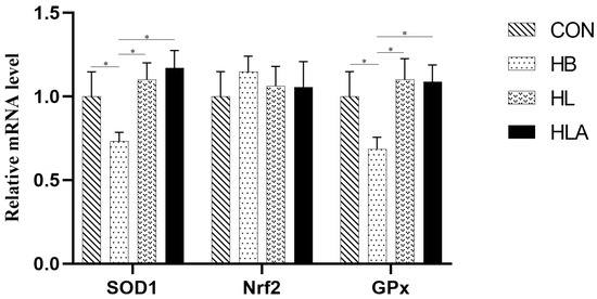 According to Table 7, T-SOD activity in CON was significantly higher than that in HB and HL groups (p < 0.05), and HLA was significantly higher than that in HB group (p < 0.05); MDA concentrations in the CON and HLA were lower than those in the HB and HL (p < 0.05), and the HLA was higher than the CON (p < 0.05). GPx concentration in the CON was higher than in the HB and HL (p < 0.05), the HB was lower than all other groups (p < 0.05), and the HLA showed no significant difference compared with CON and HL (p > 0.05). From Figure 2, the SOD1 and GPx in the liver were up-regulated in CON, HL and HLA compared to HB (p < 0.05).