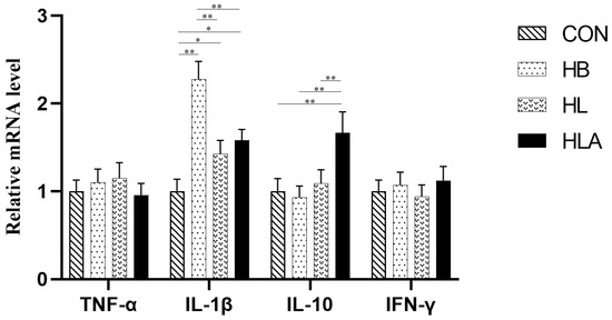 As presented in Table 8 and Table 9, the HLA had the highest concentrations of IgA, IgG, and IgM compared to the other groups (p < 0.05). Specifically, the CON had higher IgA and IgM concentration compared to the HB and HL (p < 0.05), while the HB had lower IgG and IgM concentration compared to the HL (p < 0.05). IL-1β concentration was higher in the HB compared to other groups (p < 0.05), while the HL and HLA were not significantly different from each other (p > 0.05), but were both higher than CON (p < 0.05). For IL-10, the HLA showed a higher concentration than the other groups (p < 0.05), which did not differ significantly from each other (p > 0.05). As shown in Figure 3, in the liver, the IL-1β mRNA level was highest in HB (p < 0.01), and was also higher in HL and HLA than in CON (p < 0.05). The relative expression level of IL-10 mRNA in HLA was significantly higher than that in other groups (p < 0.05).