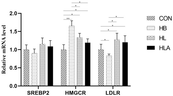 According to Table 10, T-CHO concentration was lowest in the CON compared to the other groups (p < 0.05). In addition, the HL and HLA had lower T-CHO concentrations and AST activity than the HB (p < 0.05). Moreover, the HL exhibited higher concentration of HDL-C than the CON (p < 0.05), while the HB showed higher concentration of LDL-C compared to the CON and HLA (p < 0.05). Regarding TG and GLU content, the CON had lower concentration than the TRT (p < 0.05), while the HL and HLA had lower concentration than the HB (p < 0.05). From Figure 4, in the liver, the HMGCR mRNA level was highest in HB (p < 0.01), and was also higher in HL and HLA than in CON (p < 0.05). LDLR was up-regulated in CON, HL and HLA compared to HB (p < 0.05), and also higher in HL and HLA than in CON (p < 0.05).