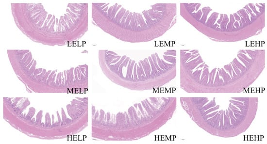 Microscopic images of the jejunum (scale bar = 200 μm). Low ME, low CP group (LELP); low ME, medium CP group (LEMP); low ME, high CP group (LEHP); medium ME, low CP group (MELP); medium ME, medium CP group (MEMP); medium ME, high CP group (MEHP); high ME, low CP group (HELP); high ME, medium CP group (HEMP); high ME, high CP group (HEHP).