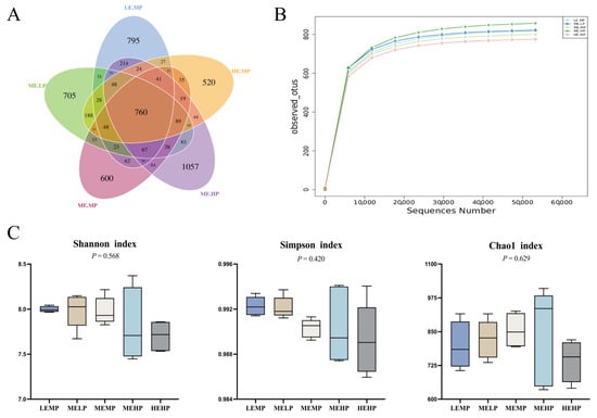 The intestinal microbiota of Jingyuan chickens in the LEMP, MELP, MEMP, MEHP, and HEMP groups shared 760 operational taxonomic units (OTUs), as shown in Figure 2A. When the relative abundance of OTUs in each group dropped below 10−4, the rarefaction curves gradually leveled off, indicating sufficient sequencing depth and a relatively even species distribution, as illustrated in Figure 2B. Figure 2C shows that no significant differences (p > 0.05) in the Shannon, Simpson, and Chao 1 indices were noted among the groups with respect to cecal microbiota.