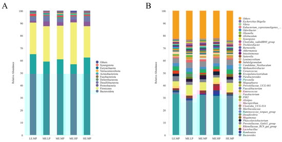 Effects of different ME and CP levels on the composition of cecal microbiota at the phylum and genus levels in Jingyuan chickens. (A) Relative abundance of dominant bacterial phyla in each group. (B) Relative abundance of dominant bacterial genera in each group. Groups: LEMP (low ME and medium CP), MELP (medium ME and low CP), MEMP (medium ME and medium CP), MEHP (medium ME and high CP), and HEMP (high ME and medium CP).