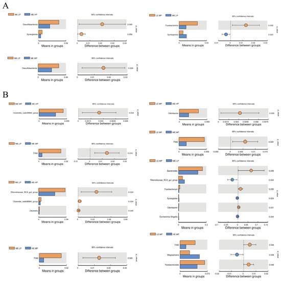 Bacteroides, Romboutsia, Lactobacillus, Rikenellaceae_RC9_gut_group, and Muribaculaceae were identified as the dominant genera in the cecum. The relative abundance of Clostridia_vadinBB60_group was significantly lower in the MEHP group than that in the MEMP group (0.54% vs. 0.79%), whereas the relative abundance of F082 was significantly higher in both the MELP (0.24% vs. 1.62%) and LEMP (0.24% vs. 0.84%) groups. The MEHP group exhibited a significant decrease in Rikenellaceae_RC9_gut_group (8.60% vs. 4.27%), Clostridia_vadinBB60_group (0.81% vs. 0.54%), and Olsenella (0.27% vs. 0.19%) compared with that in the MELP group. Relative to the LEMP group, the MEHP group showed a significant decrease in the abundance of Odoribacter (0.62% vs. 0.30%). The MELP group had a significantly lower relative abundance of Bacteroides (34.56% vs. 27.95%), Fusobacterium (2.0% vs. 0.75%), and Odoribacter (0.62% vs. 0.29%) but a higher relative abundance of Rikenellaceae_RC9_gut_group (5.70% vs. 8.60%), Synergistes (0.41% vs. 0.78%), and Escherichia-Shigella (0.22% vs. 0.49%) compared with that in the LEMP group. The HEMP group exhibited a significant reduction in the relative abundance of F082 (0.84% vs. 0.32%) and Parabacteroides (1.36% vs. 0.94%) but an increase in the relative abundance Megasphaera (0.53% vs. 1.06%) compared with that in the LEMP group. These differences are illustrated in Figure 4B.