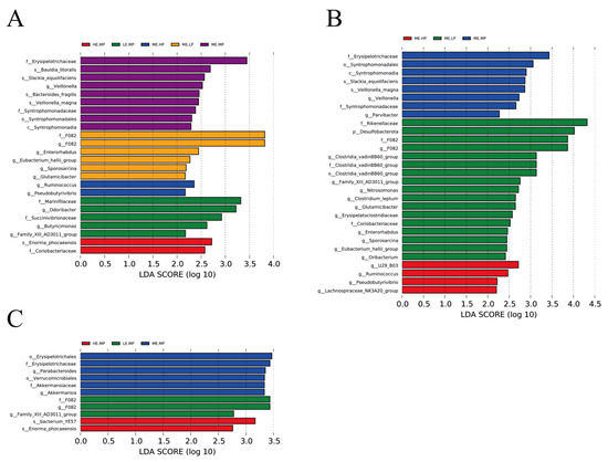 Identification of significantly different taxa among groups using linear discriminant analysis effect size (LEfSe) with default parameters (LDA score = 2). (A) Taxa representing significant differences among LEMP (low ME and medium CP), MELP (medium ME and low CP), MEMP (medium ME and medium CP), MEHP (medium ME and high CP), and HEMP (high ME and medium CP) groups. (B) Taxa representing significant differences among MELP, MEMP, and MEHP groups. (C) Taxa representing significant differences among LEMP, MEMP, and HEMP groups.