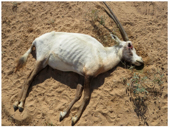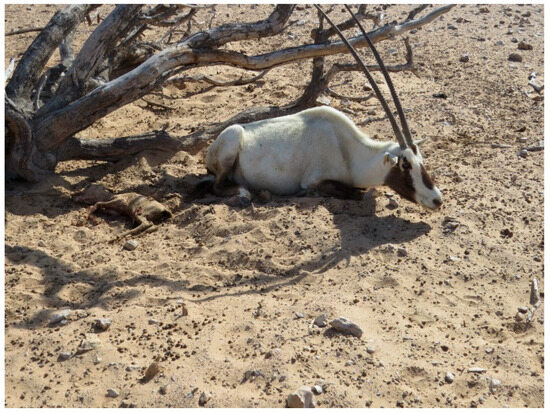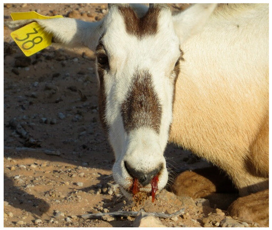 - Ostrowski, S.; Anajariyah, S. 2002 Middle East Arabian Oryx Disease Survey; National Wildlife Research Center: Taif, Saudi Arabia, 2003. [Google Scholar]