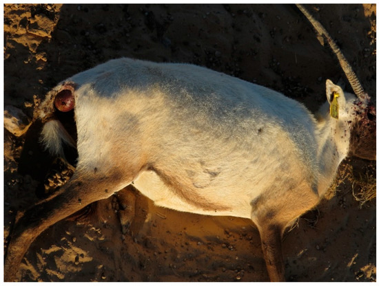 Dead Arabian oryx in poor body conditions. Ocular lesions are due to scavenger birds.