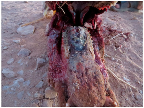 Lesions consisted in aphthae appearing in the oral cavity and evolving in erosive lesions. The erosions were observed on the gum of the upper lip, gingival mucosa (Figure 5), including peri dental gingiva, tongue (upper epithelium and lower mucosa) (Figure 6), and palate being eventually covered by necrotic caseous material (Figure 7). No animals showed lesions at the level of coronary band. The gastrointestinal tract was distended by accumulation of gas and presented serosal hemorrhages (Figure 8) and in some cases deposits of fibrinous exudate.