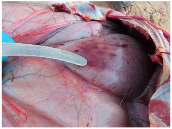 The monitoring of the Arabian oryx herds showed that clinical symptoms appeared first among the animals present in the maha 1 enclosure out of four, then rapidly diffused in the other three herds located in the other enclosures. The first sign of illness was inappetence. On the first day of the outbreak (the 8th of January 2025), the 25% of oryx showed inappetence. Then, on the third day, all other animals showed the same behavior, indicating a morbidity rate of 100%. Rapidly, other symptoms could be observed. Animals showed asthenia, reluctancy to move, preferring lying on the ground, and often acquiring abnormal postures, with head and neck turned backwards along the flank or extended limbs. Clinical symptoms were characterized by drooling (abundant salivation), limping (abnormal asymmetric gate), watery diarrhea (in some cases with mucus or blood-tinged), tympanism (inducing animals to kick their flanks), vomiting, in some cases bleeding from nostrils (Figure 1), and prostration and death in more severe cases (Figure 2). The severity of the clinical course was high among pregnant and calves, causing mortality among adults, especially at term of pregnancy (Figure 3), stillbirth (Figure 4), or early death of newborns, which was relatively high in other adult females and less severe in adult males.