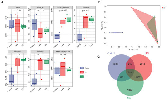 Alpha diversity assessment (Figure 1A) demonstrated significantly elevated Good’s coverage indices in LE1 and LE2 compared with controls (p < 0.05). Although Pielou’s evenness index, Simpson’s index, and Shannon’s index did not show significant increases in all three groups, these trends suggest that the evenness and diversity of the community had improved after the implementation of the intervention measures.