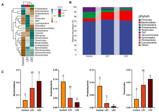 To further clarify the inter-sample variations in species composition and to illustrate the trends in abundance distribution across samples, we constructed a heatmap of species composition utilizing the abundance data of the top 20 phyla ranked by their average abundance (Figure 2A). Furthermore, by integrating the observed group-level compositional differences derived from the heatmap with a statistical analysis of a feature table that has been filtered to remove singletons, we visualized the microbial composition at the phylum level (Figure 2B). The predominant bacterial phyla identified in the feces of young sika deer were Firmicutes (71.89%), Bacteroidetes (14.19%), Actinobacteria (7.18%), Proteobacteria (3.63%), Tenericutes (1.58%), TM7 (0.41%), Verrucomicrobia (0.39%), Spirochaetes (0.27%), Fibrobacteres (0.18%), and Cyanobacteria (0.06%). Notably, the relative abundances of Actinobacteria and Proteobacteria were significantly diminished in both LE1 and LE2 groups when compared to the control group (p < 0.05). Furthermore, the LE2 group demonstrated a significantly greater abundance of Tenericutes and Bacteroidetes compared to the control group (p < 0.05) (Figure 2C).
