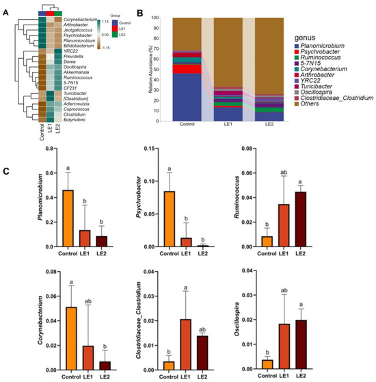 We generated a heatmap illustrating species composition based on the abundance data of the top 20 genera ranked by average abundance (Figure 3A). By further integrating the intergroup compositional differences observed in the heatmap with statistical analyses of a feature table (filtered to exclude single-copy sequences), we visualized microbial composition at the genus level (Figure 3B). Comprehensive analysis of Figure 3A,B revealed the following predominant bacterial genera in young sika deer feces: Planomicrobium (22.76%), Psychrobacter (3.35%), Ruminococcus (2.93%), 5-7N15 (2.88%), Corynebacterium (2.52%), Prevotella (1.67%), Arthrobacter (1.92%), YRC22 (1.83%), Turicibacter (1.71%), Oscillospira (1.40%), and Clostridiaceae_Clostridium (1.27%). The remaining genera collectively accounted for 57.42% of the total. Notably, the abundances of Planomicrobium and Psychrobacter were significantly reduced in both LE1 and LE2 groups compared to the control group (p < 0.05). In contrast, the LE2 group showed significantly higher abundances of Ruminococcus and Oscillospira relative to the control group (p < 0.05). Additionally, Corynebacterium abundance was markedly decreased in the LE2 group (p < 0.05), while Clostridiaceae_Clostridium abundance was significantly increased in the LE1 group compared to that of the control group (p < 0.05) (Figure 3C).