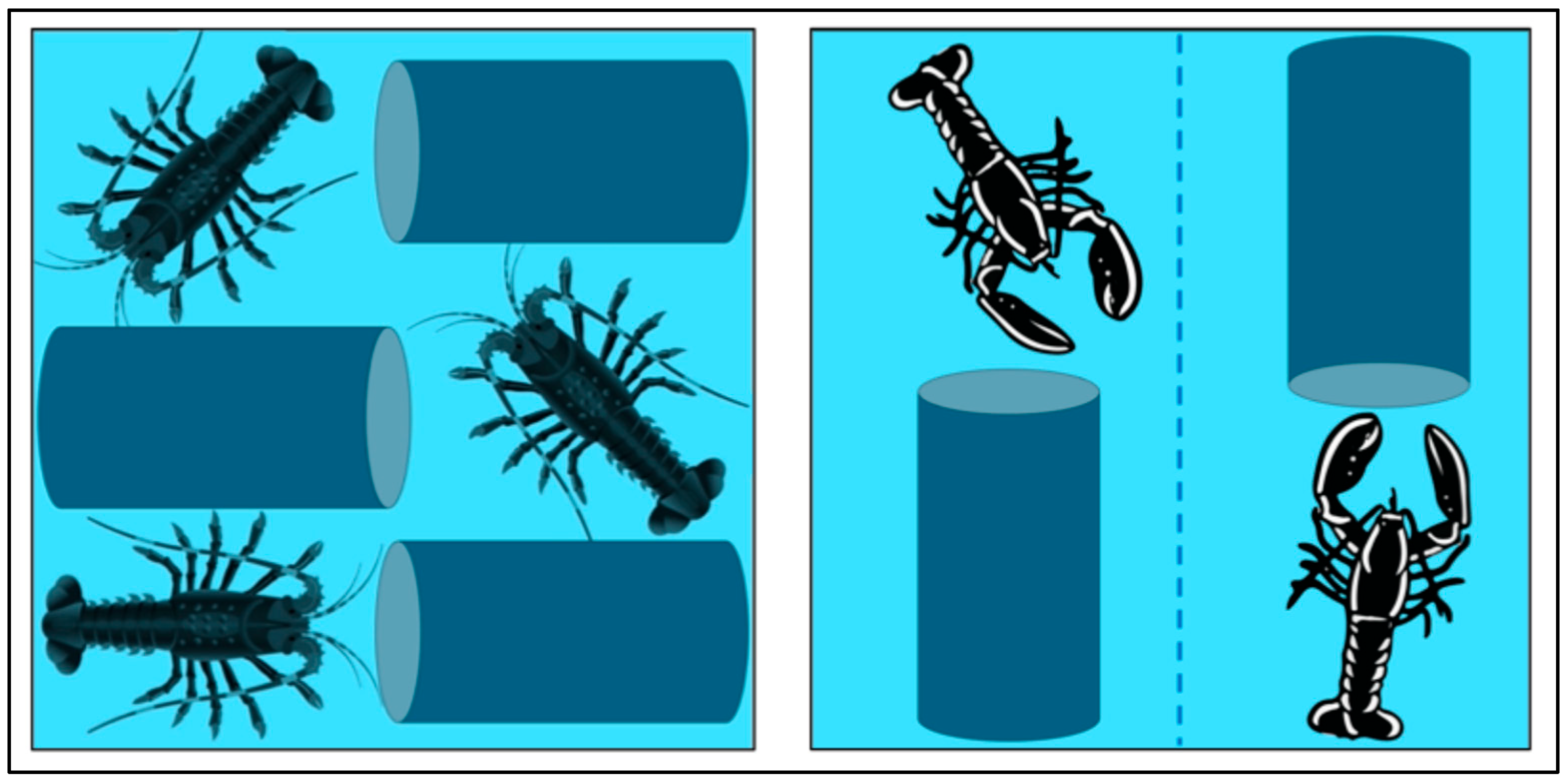 - Cenni, F.; Parisi, G.; Gherardi, F. Effects of Habitat Complexity on the Aggressive Behaviour of the American Lobster (Homarus americanus) in Captivity. Appl. Anim. Behav. Sci. 2010, 122, 63–70. [Google Scholar] [CrossRef]