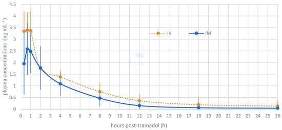 Mean plasma concentration profile of tramadol versus time for intravenous tramadol administration and intramuscular tramadol administration at a dose of 5 mg kg−1 in Boa constrictors (n = 10).
