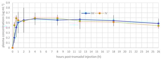 The mean residence time of tramadol was 12.38 ± 8.3 h following intravenous administration and 9.29 ± 5.24 h following intramuscular administration, suggesting that intravenous administration results in prolonged retention of the drug in the body. This extended duration is likely attributable to the reduced metabolic rate observed in these animals [6,13].