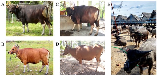 Representative appearances of Bali (Bos javanicus domesticus; (A), male; (B), female) and Jaliteng ((C), male; (D), female) cattle, a crossbreed between Bali and banteng cattle (B. javanicus), and water buffaloes (Bubalus bubalis, (E)), which were used in this study.