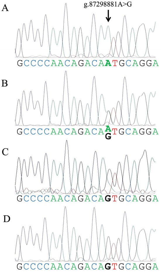 Representative Sanger sequencing electropherograms illustrating the A/A ((A), a Holstein Friesian cow), A/G ((B), a Bali cow), G/- ((C), a Jaliteng bull), and G/G ((D), a female water buffalo) genotypes associated with a single-nucleotide variant (arrow, g.87298881A>G) in the upstream of the bovine FOXP3 gene.