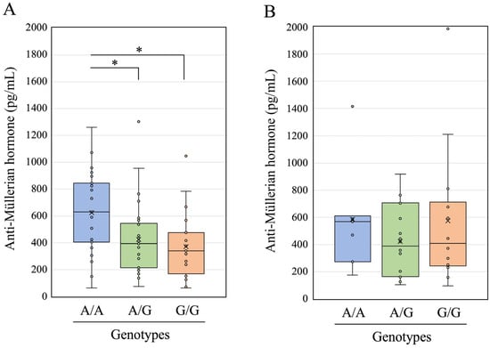Anti-Müllerian hormone concentration in parous cows (A) and non-parous cows (B) with three different genotypes (A/A, A/G, and G/G) of a single-nucleotide variant (g.87298881A>G) upstream of the bovine FOXP3 gene. * Differences in data between different groups were statistically significant (p < 0.05) using the Wilcoxon rank sum exact test with Bonferroni correction.