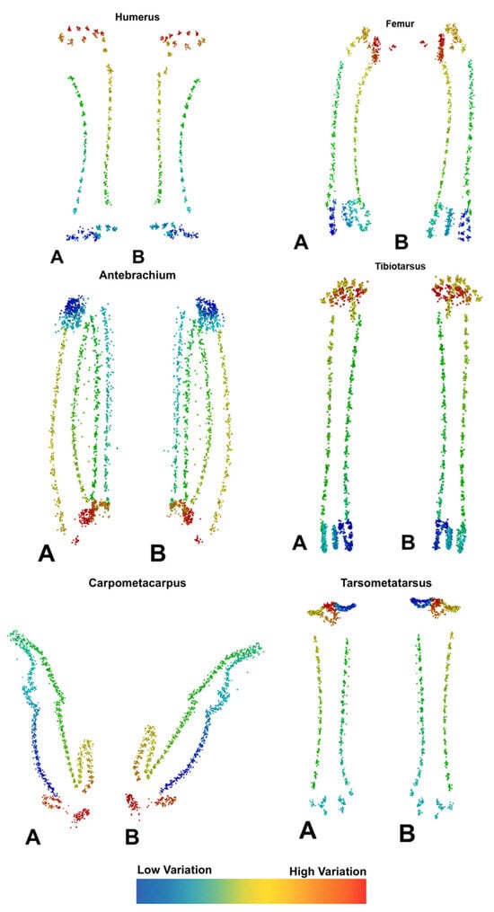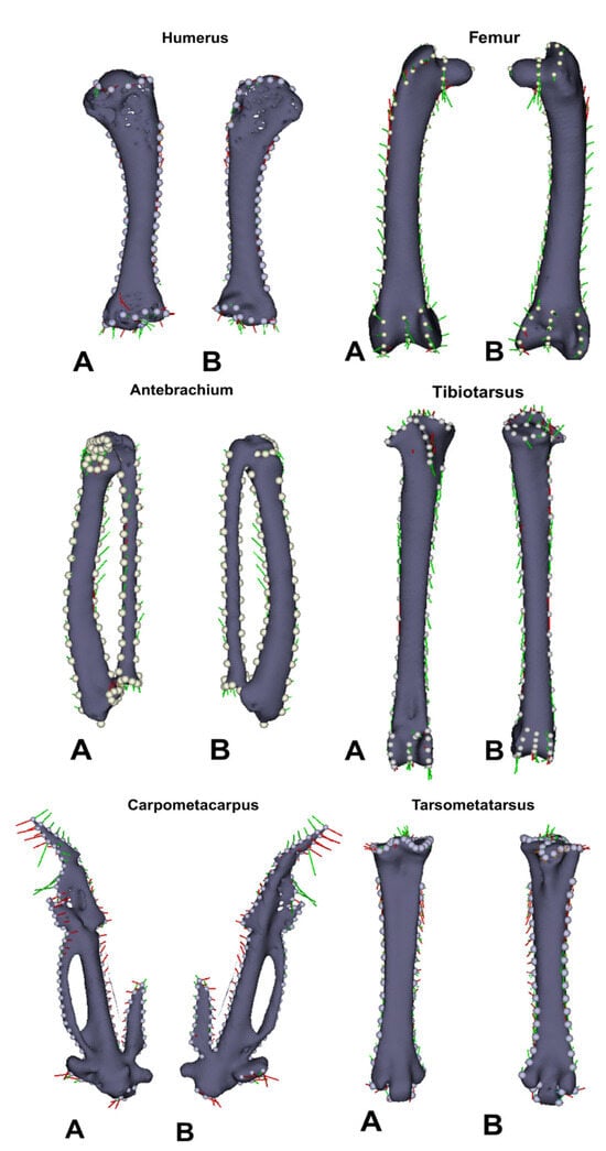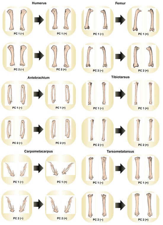 In parallel with these findings, significant morphologic differences were observed in both femur and tibiotarsus bones in the probiotic-treated group compared to the control group. In the femur, significant alterations were identified in structural characteristics such as the location of the fovea capitis femoris, the length of the collum femoris, and the position of the trochanter major. In the tibiotarsus, displacement, shape differentiation, and volume increase were observed in regions including the facies articularis, crista cnemialis, and canalis extensorius. The findings support the hypothesis that probiotic supplementation positively affects bone development, both dimensionally and structurally, and that shape analysis methods have high sensitivity in revealing these changes. The 3D geometric morphometry method utilized in the present study elucidated the morphologic variations that occur, particularly in long bones such as the femur and the tibiotarsus. Landmark-based analyses have been instrumental in determining the precise orientational and regional changes that occur between specific anatomical points of the bones. This has enabled the presentation of morphological differences in 3D comparisons. The data obtained were not only limited to numerical analysis but also supported by high-resolution visual outputs. The impact of probiotic administration on the femur and tibiotarsus bones has been substantiated, both statistically and visually.