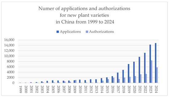 Moreover, sui generis protection regimes within the intellectual property system in China have demonstrated clear incentive effects and practical benefits. Intellectual property regimes help ensure the quality and safety of breeds, regulate innovation collaborations, protect consumer rights, and promote the rational allocation of resources [52]. For instance, Regulations on the Protection of New Plant Varieties in China grant exclusive rights to breeders, thereby encouraging innovation and enhancing breeding enthusiasm. Since their adoption in 1997, these regulations have undergone three revisions (in 2013, 2014, and 2025). Between 1999 and 2024, the Ministry of Agriculture and Rural Affairs issued eleven batches of the Protection List of Agricultural Plant Varieties, covering a total of 191 plant genera and species (Figure 1). Applications for new plant variety rights have continued to increase, reaching a cumulative total of 91,753 applications and 37,283 grants by the end of 2024 (Figure 2).