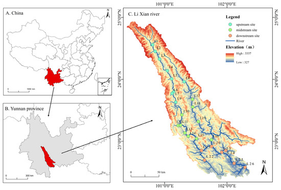 Distribution of eDNA water sampling sites in the Lixian River. (A) Map of China, with Yunnan Province in red. (B) Map of Yunnan Province, with Lixian River basin in red. (C) Map of the Lixian River basin, where L1–L26 indicates the sampling sites, with fill colors of blue, green, and orange indicating the upstream, midstream, and downstream sites, respectively.